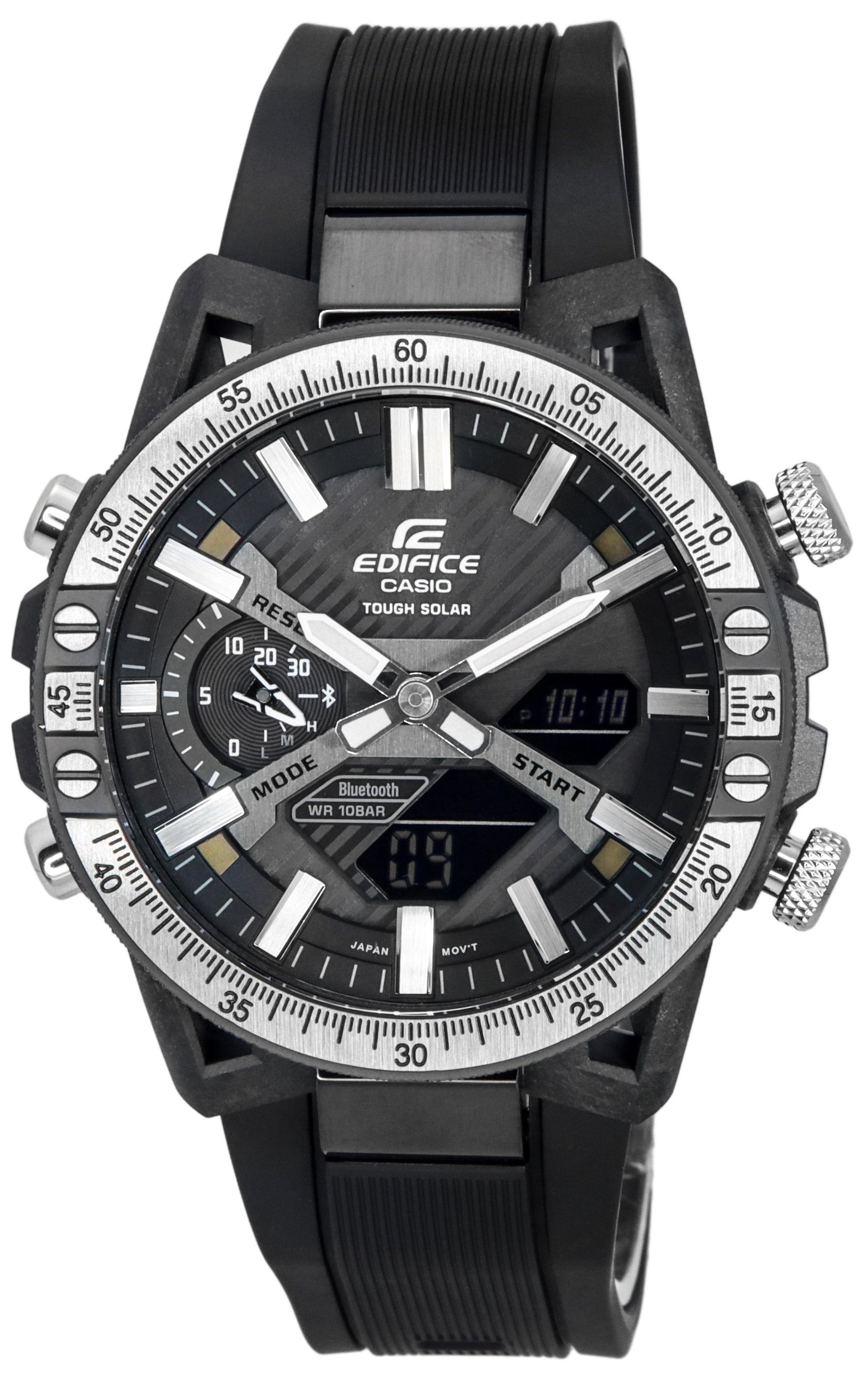 Features: Carbon Composite Case Resin Strap Tough Solar Powered Caliber: 5698 Mineral Crystal Black Dial Analog Digital Display Mobile Link Auto Time Adjustment Easy Watch Setting Approximately 300 World Time Cities Stopwatch Data Transfer Time Place Phone Finder Black Ion Plated Bezel World Time 1/100-Second Stopwatch Countdown Timer 5 Daily Alarms Hourly Time Signal Double Led Light Full Auto-Calendar Button Operation Tone On/Off Power Saving Approximately Battery Operating Time 7 Months On Rechargeable Battery 18 Months On Rechargeable Battery Hand Shift Feature 12/24 Hours Display Luminous Hands Day And Date Display Screwed Case Back Buckle Clasp 100m Water Resistance Approximate Case Diameter: 47.8mm Approximate Case Thickness: 11.3mm Approximate Lug Width : 13mm