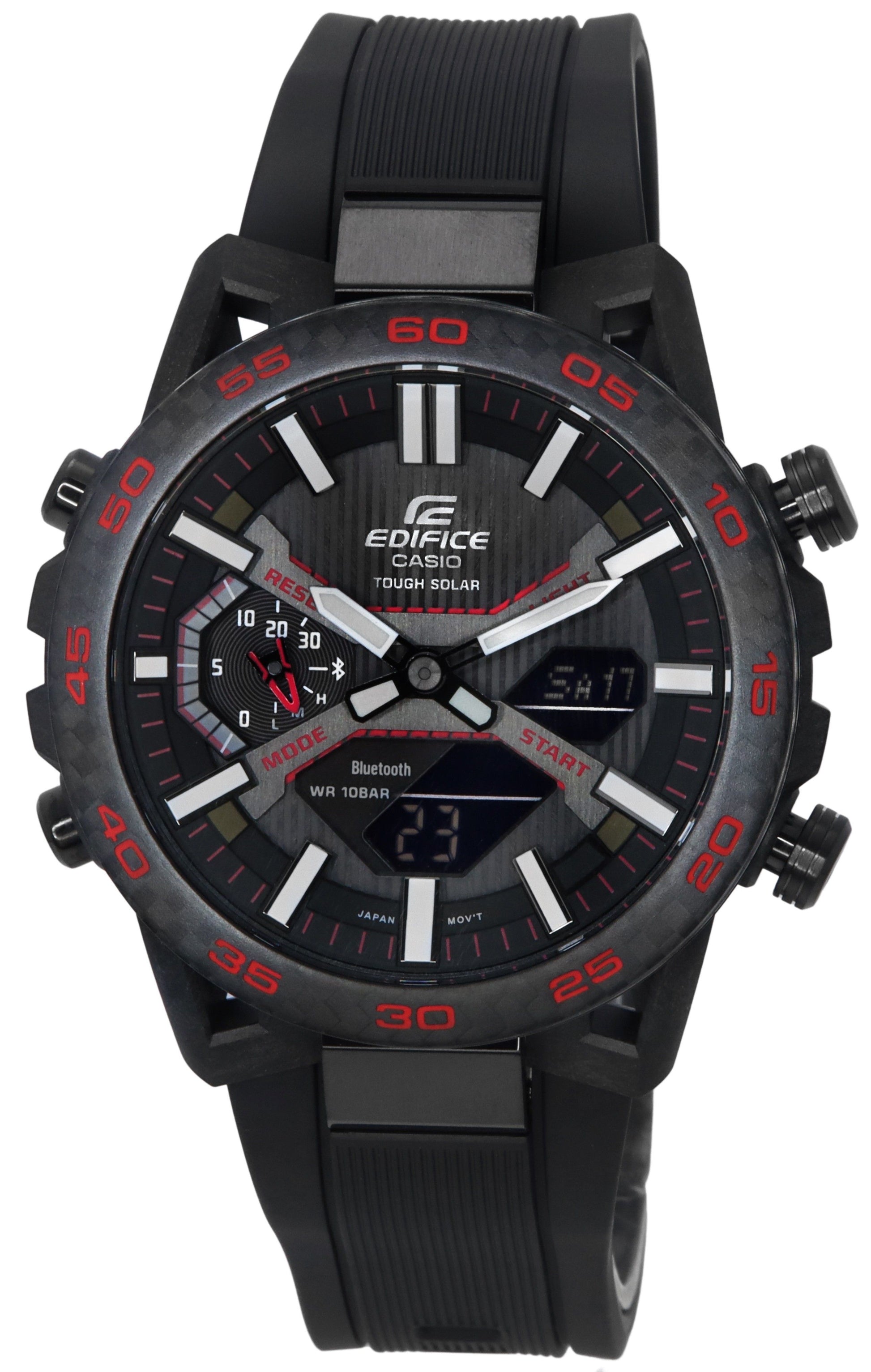 Features: Carbon Composite Case Resin Strap Solar Movement Mineral Crystal Caliber: 5698 Black Dial Analog Digital Display Mobile Link Auto Time Adjustment Easy Watch Setting Approximately 300 World Time Cities Stopwatch Data Transfer Time Place Phone Finder World Time Neobrite 1/100 Second Stopwatch Countdown Timer 5 Daily Alarms Hourly Time Signal Double Led Light Full Auto Calendar Button Operation Tone On/Off Power Saving Battery Level Indicatorapprox. Battery Operating Time: 7 Months On Rechargeable Battery (Operation Period With Normal Use Without Exposure To Light After Charge) 18 Months On Rechargeable Battery (Operation Period When Stored In Total Darkness With The Power Save Function On After Full Charge) 12/24 Hours Display Luminous Hands Day And Date Display Screwed Case Back Buckle Clasp 100m Water Resistance Approximate Case Diameter: 47.8mm Approximate Case Thickness: 10.8mm Approximate Lug Width: 13mm