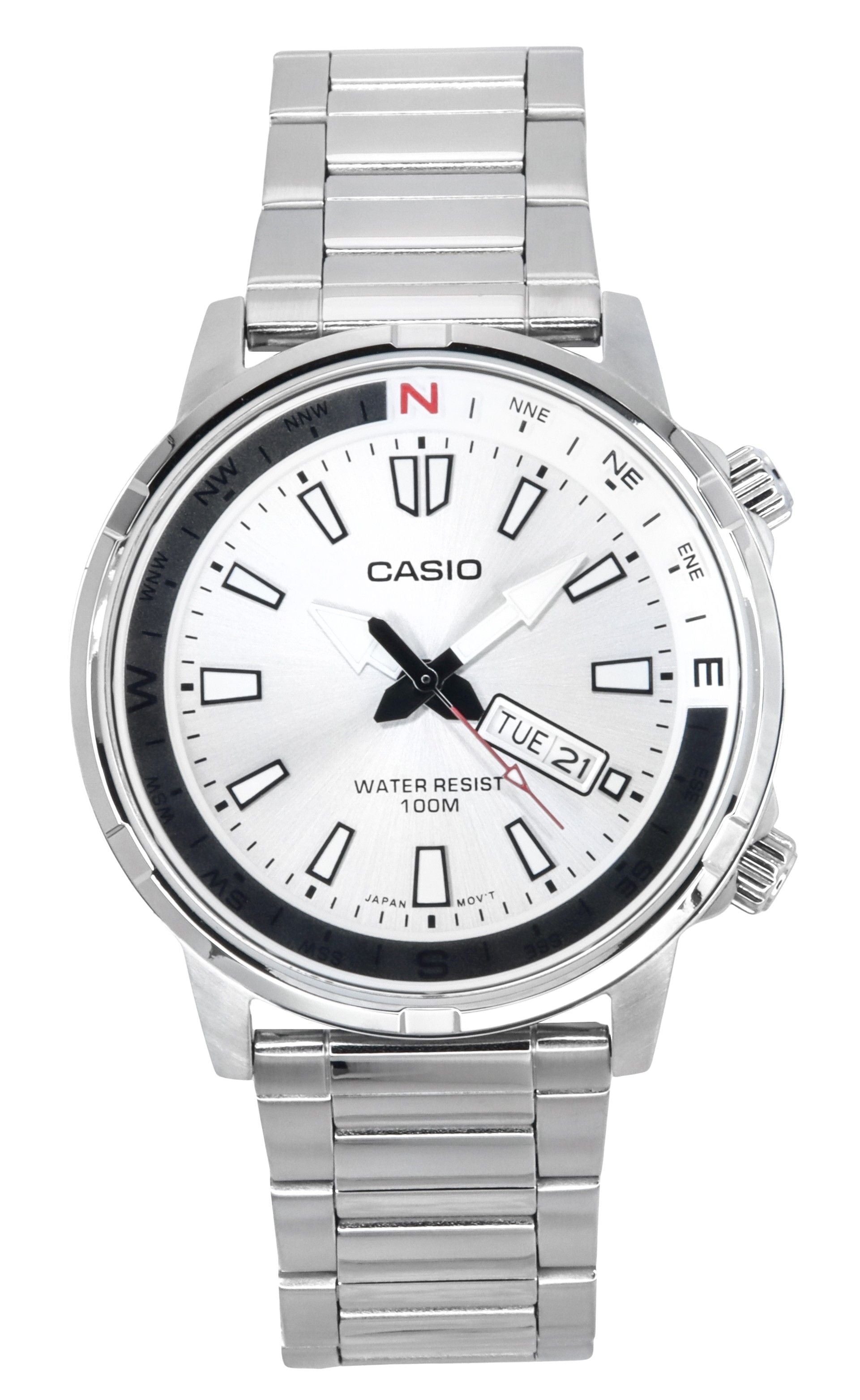Features: Stainless Steel Case Stainless Steel Bracelet Quartz Movement Mineral Crystal Silver Dial Analog Display Rotating Compass Ring Regular Timekeeping Luminous Hands And Markers Day And Date Display Solid Case Back Deployment Clasp 100m Water Resistance Approximate Case Diameter: 44mm Approximate Case Thickness: 10.1mm